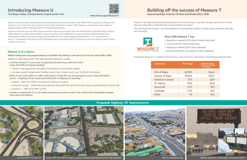 Measure U will set aside up to $56 million for regional capital improvement projects through the issuance of bonds for the opportunity to achieve long-held transportation priorities: breaking the last remaining bottlenecks on Highway 29 between Napa and American Canyon. This apportionment will position Napa County to be more competitive in securing state and federal grant funding opportunities to bring these projects to fruition.